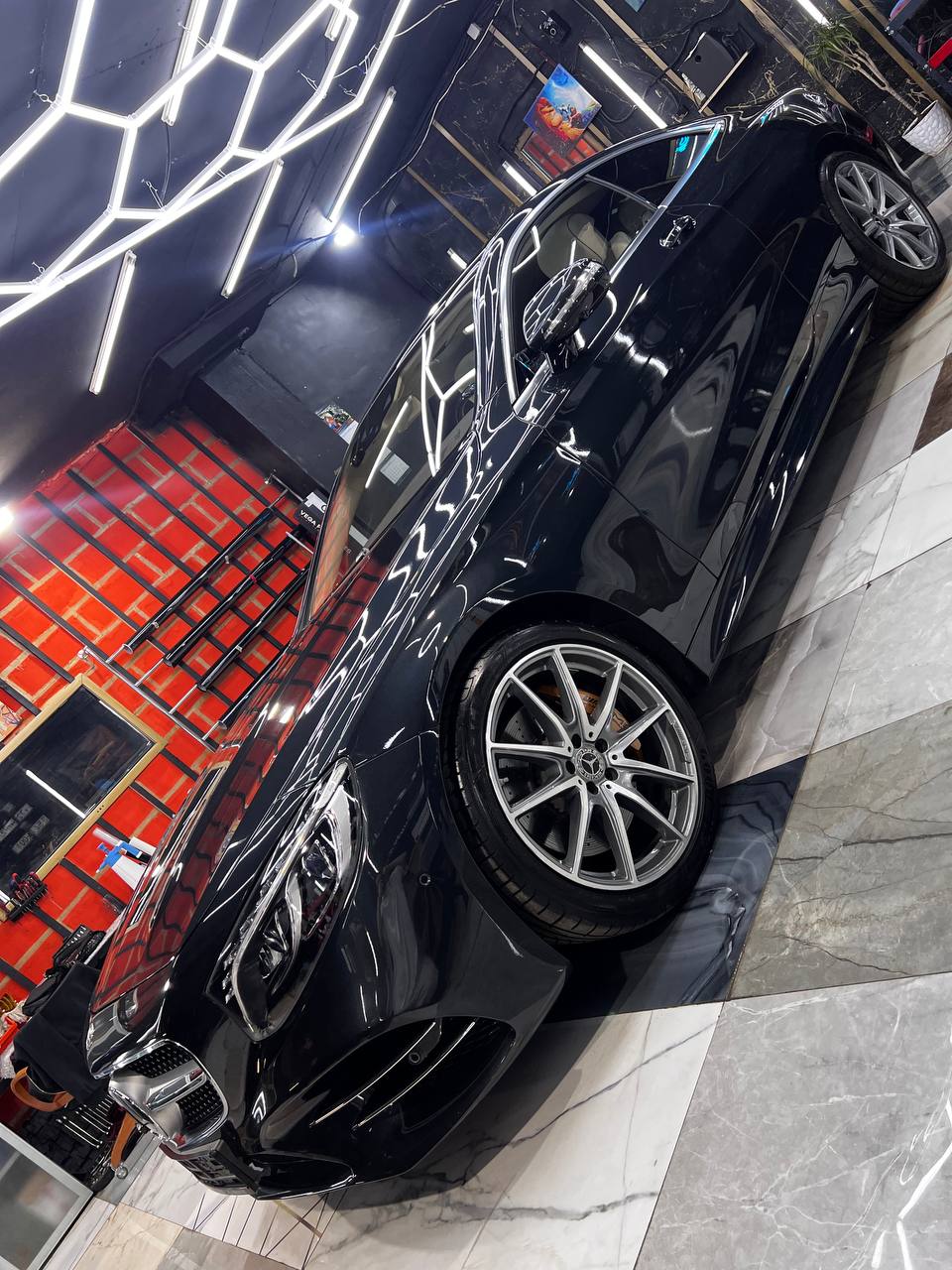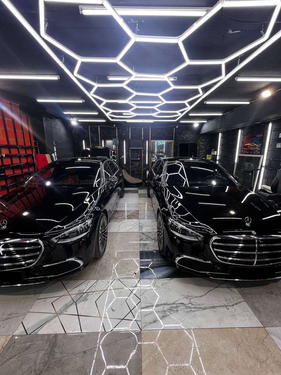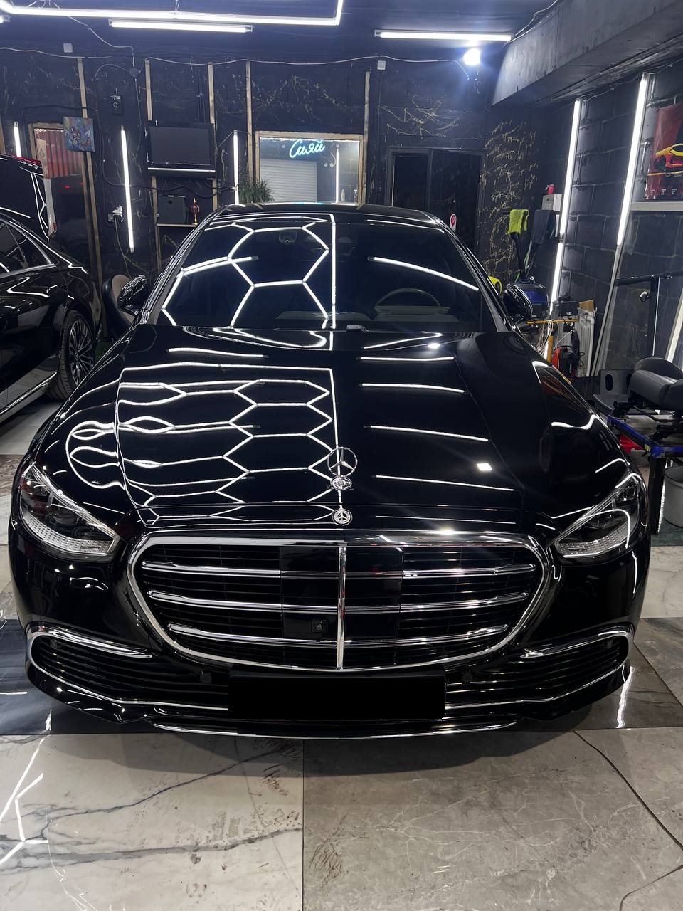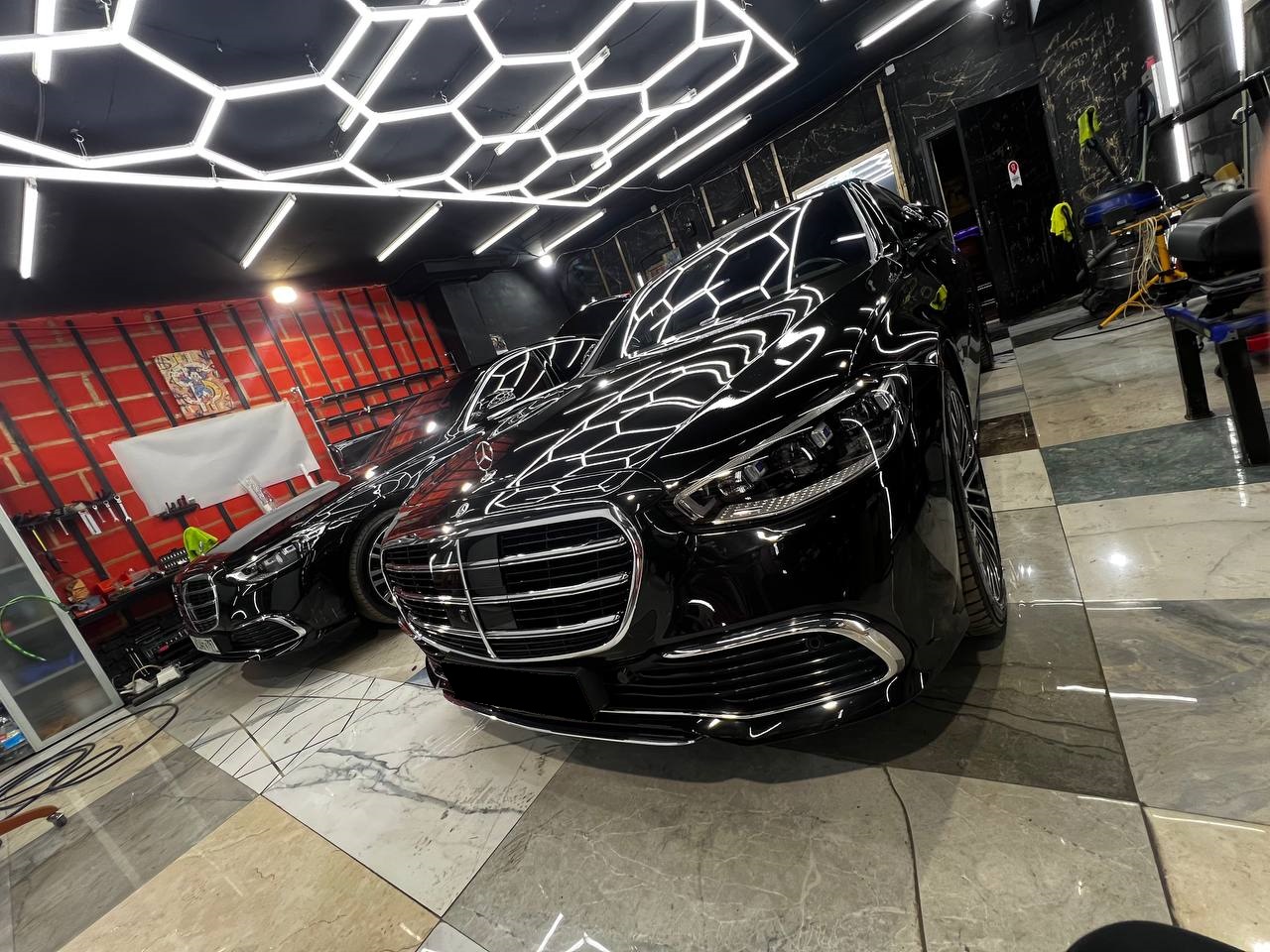 Mercedes-Benz S-Class (223 кузов) — защитили зоны риска глянцевой полиуретановой пленкой и провели бронирование лобового стекла.